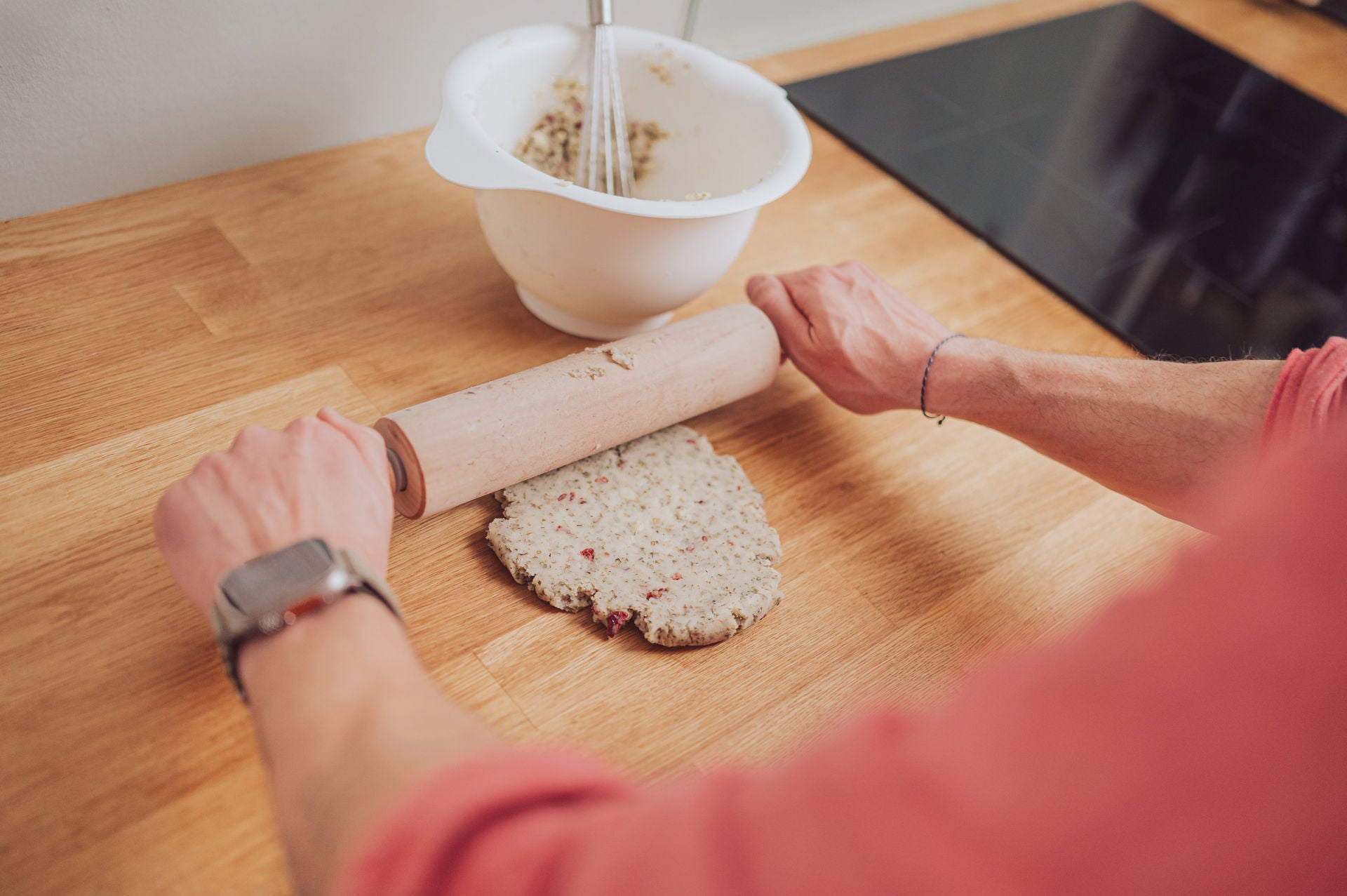 - Teig 5–8 mm dick ausrollen, ausstechen oder auf der Backmatte verstreichen.