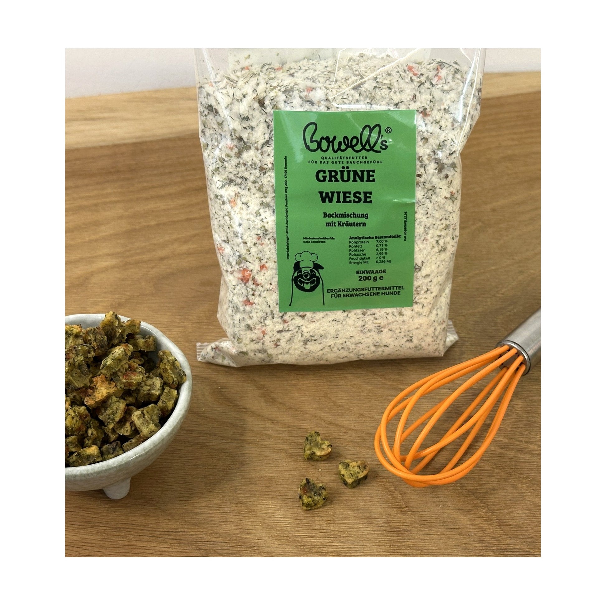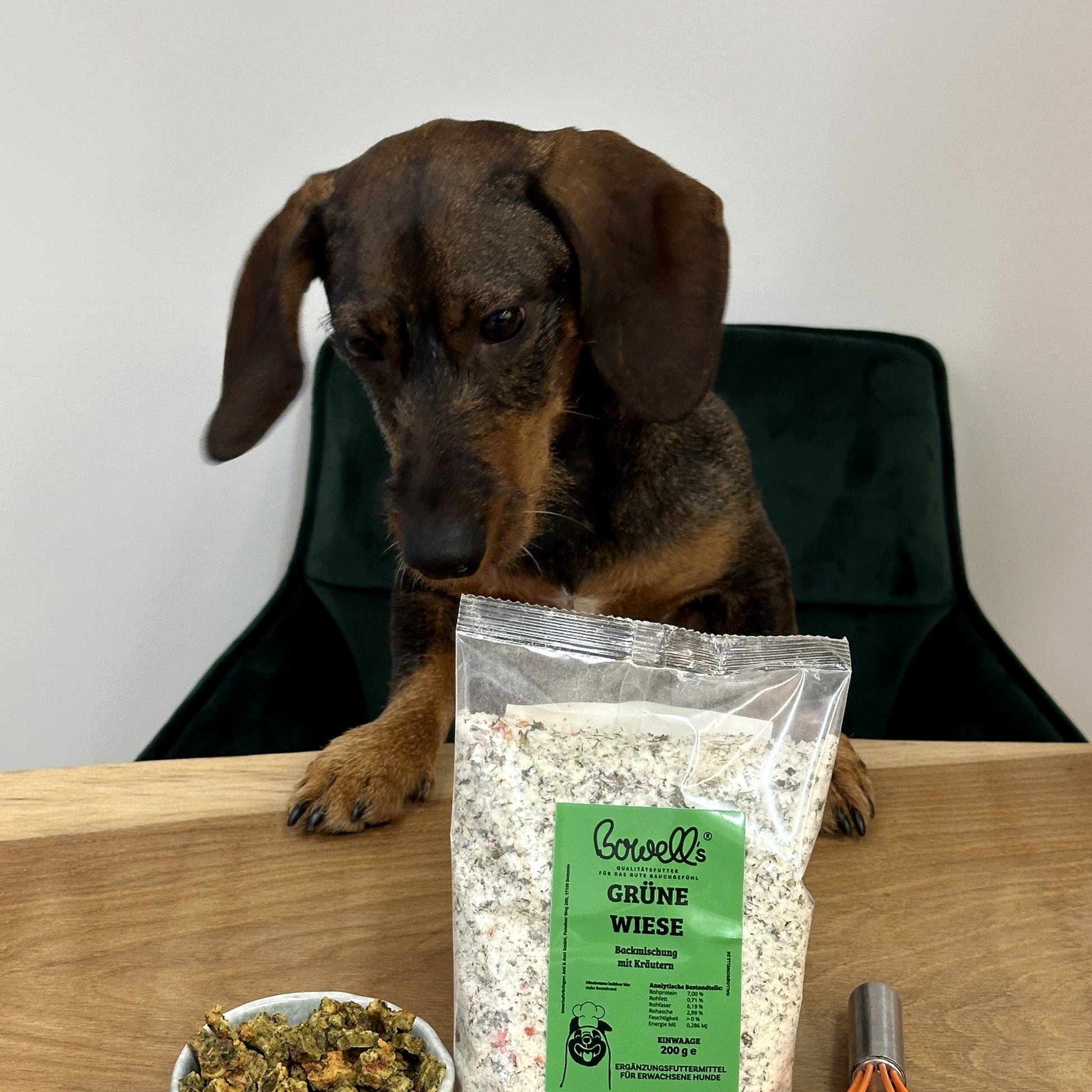 „Grüne Wiese“ bringt den frischen Kräutergarten in deine Küche: Dill, Basilikum und Majoran treffen auf Karottenwürfel und feine Kartoffelflocken. Du mischst nur Wasser dazu, rollst aus, stichst aus – fertig sind knusprige Trainingssnacks und Belohnungen für jeden Tag.