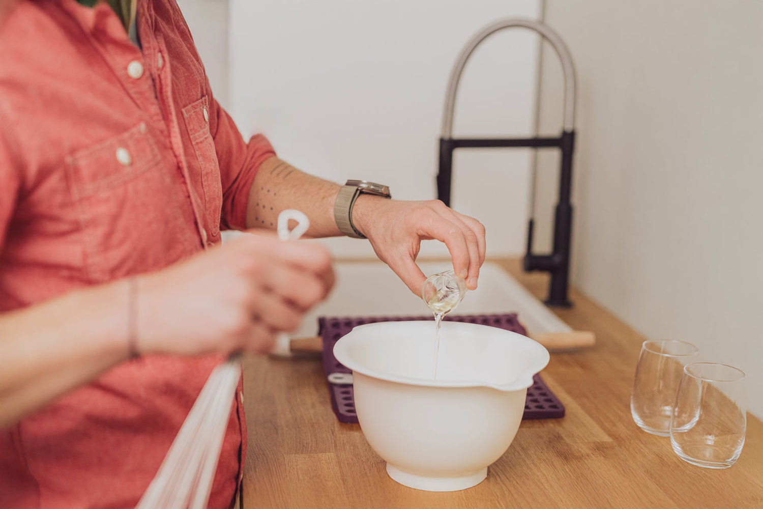 - 200 g Mischung mit 200-300 ml handwarmem Wasser, 3 Eier und 3 Esslöffel Öl zu einem formbaren Teig kneten.