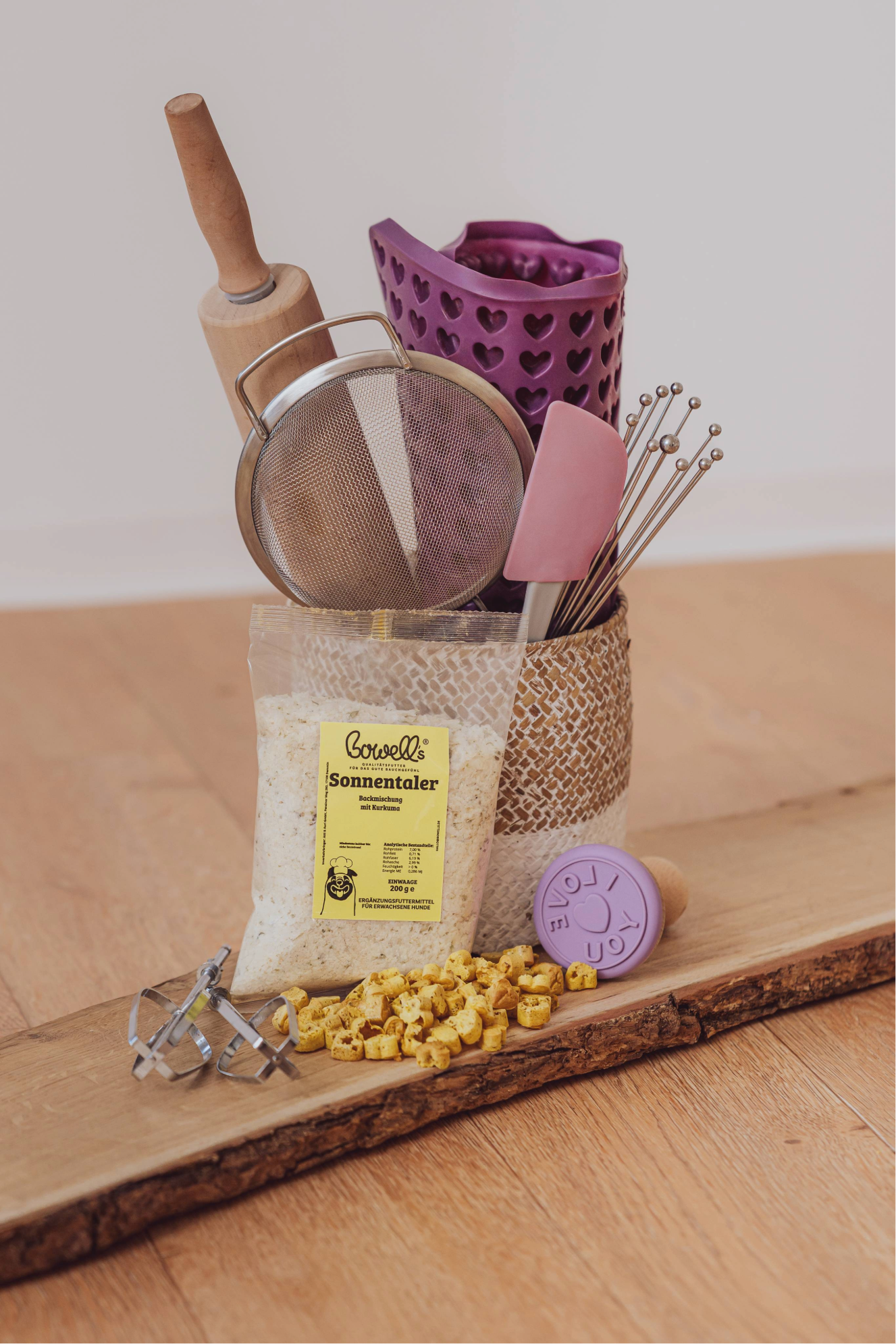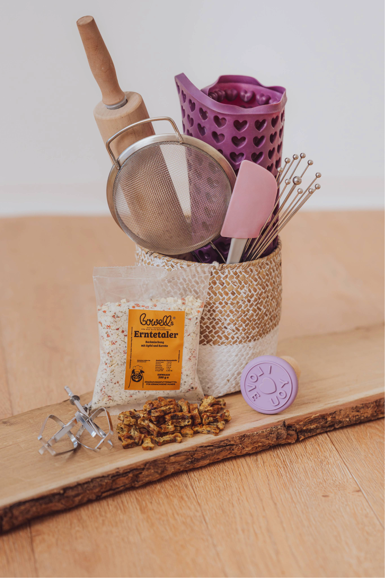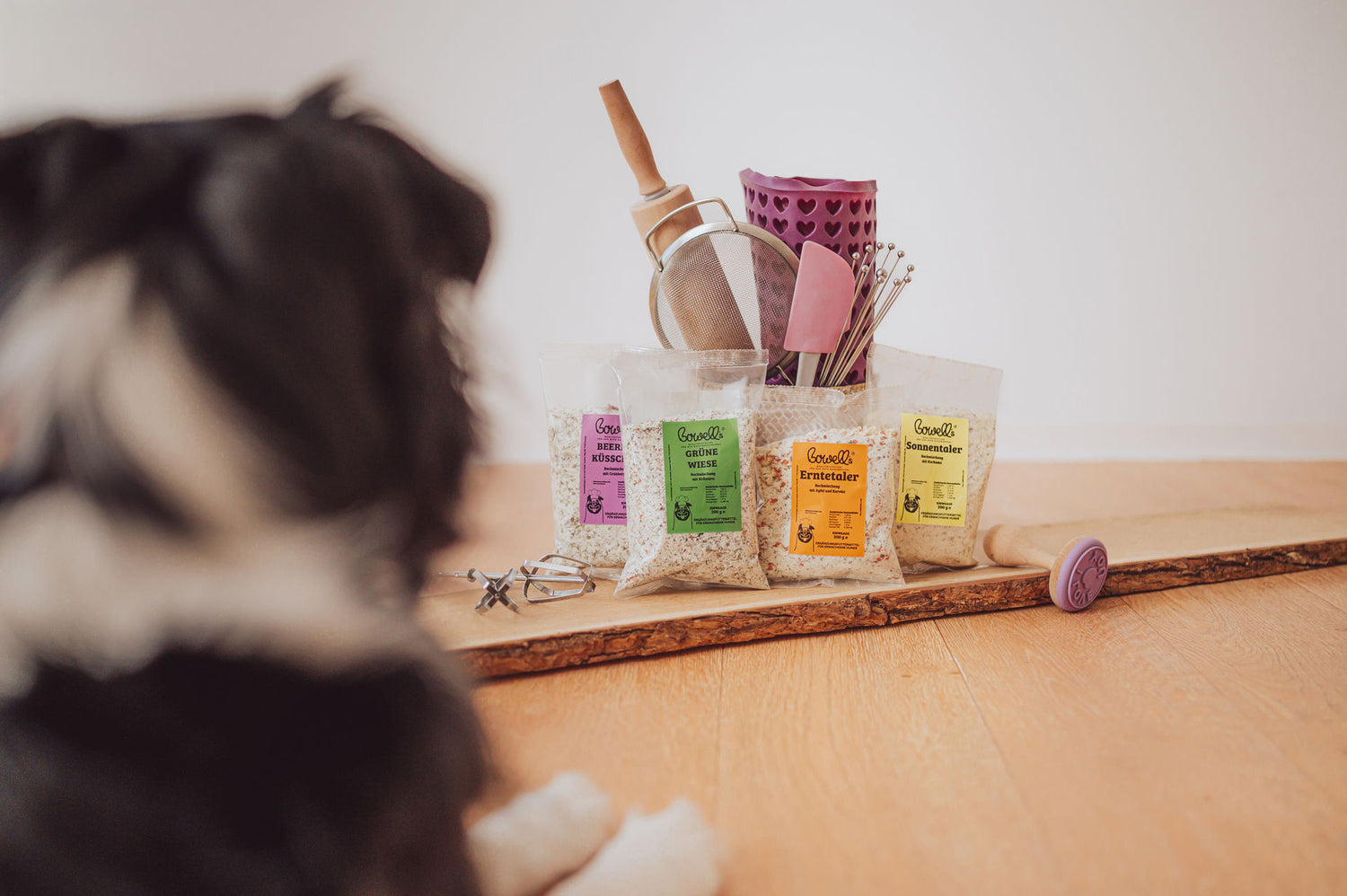 Drei naturbelassene Backmischungen und ein hochwertiges Leinöl – für knusprige Kekse in Lebensmittelqualität, die nach Liebe aus dem Ofen duften. Du kennst die Zutaten, bestimmst die Knusprigkeit und belohnst deinen Hund mit gutem Gefühl.