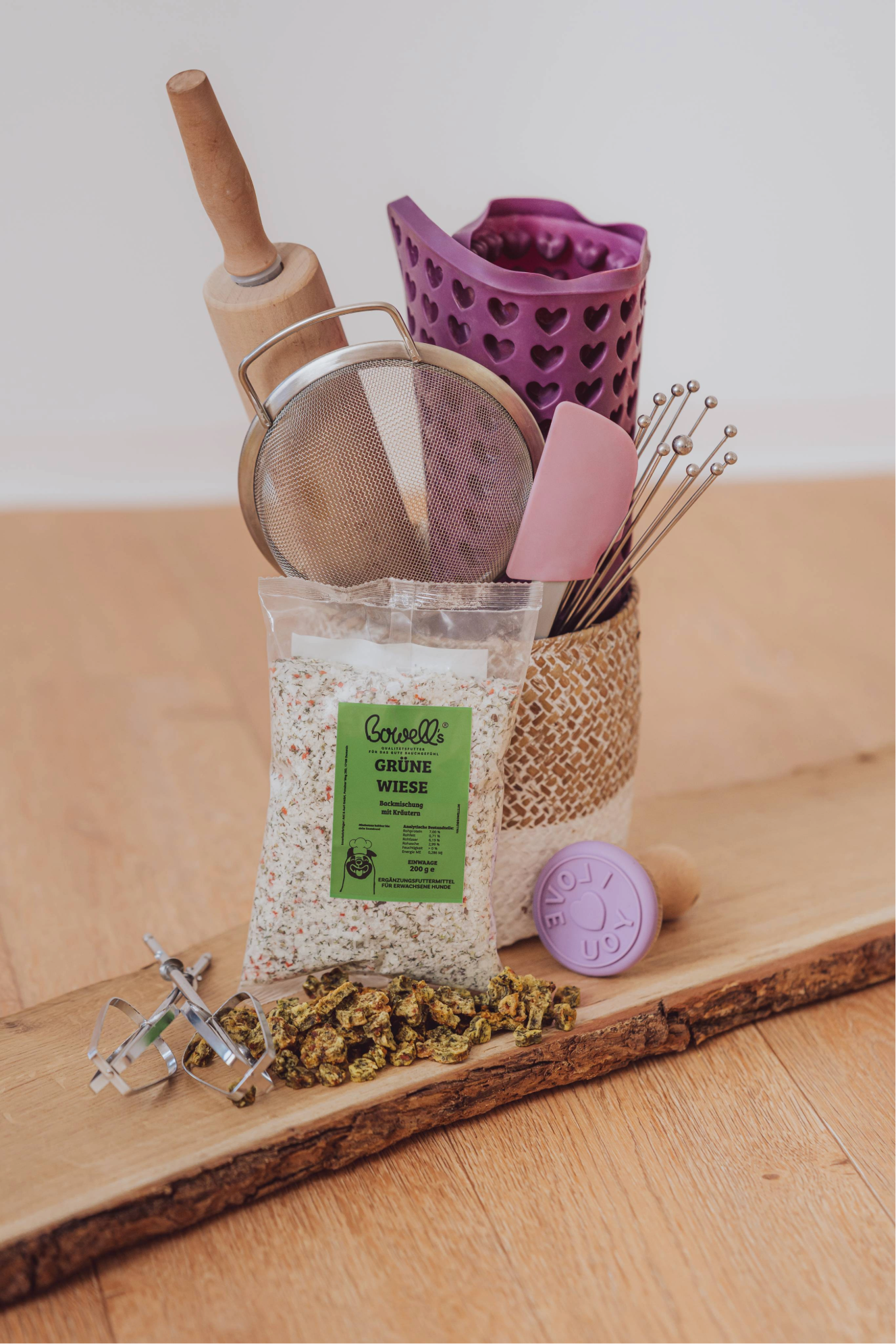 Drei knusprige Keks-Mixe, ein passendes Öl – fertig ist dein Upgrade für DIY-Hundekekse in Lebensmittelqualität. Du bekommst 3 Backmischungen (Grüne Wiese · Sonnentaler · Erntetaler) und kombinierst sie mit Leinöl....